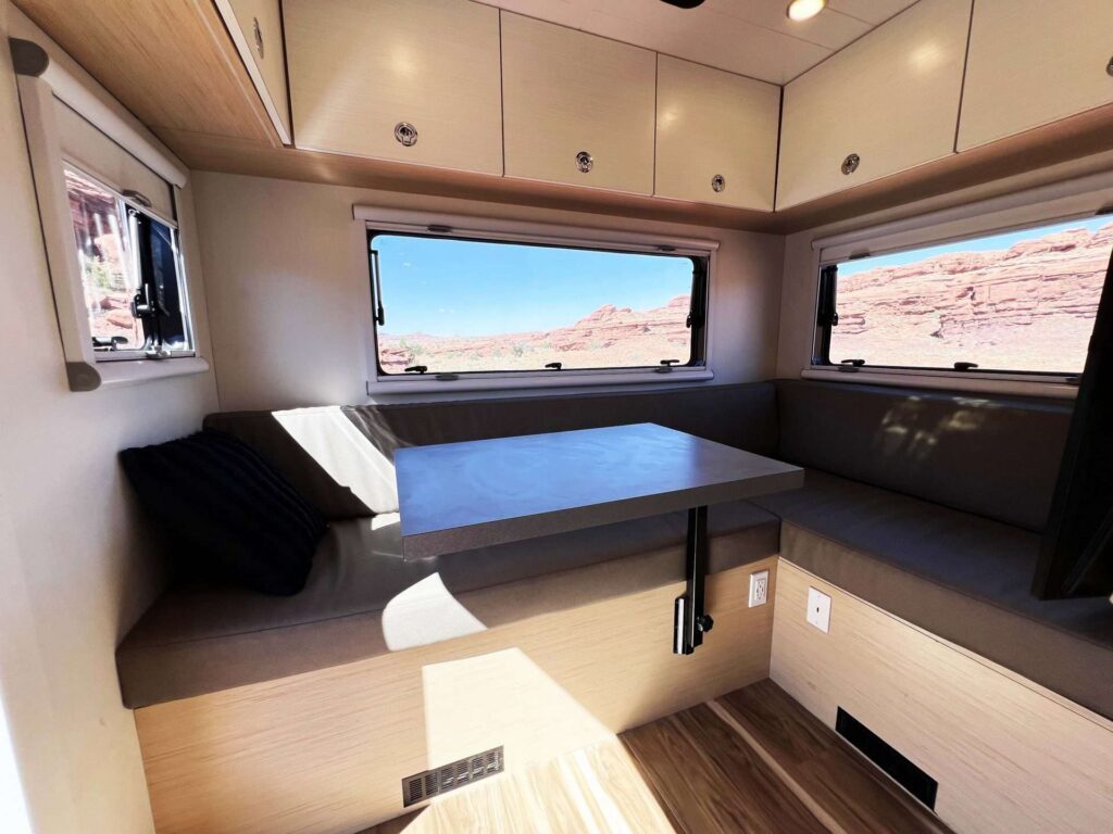| When it’s time to relax and enjoy a meal, or get out of the heat, the rear seating area in this rig is just the spot to accommodate your party. It also can double as a workspace, with power and computer connections to the TV that swivels out to the table for work, or pulls out when used as a TV for entertainment. The TV also connects to Starlink via a Roku unit, so streaming that next Netflix episode or reviewing YouTube videos of that new mountain bike you’re eyeing is right at the click or two of your mouse or remote. |
