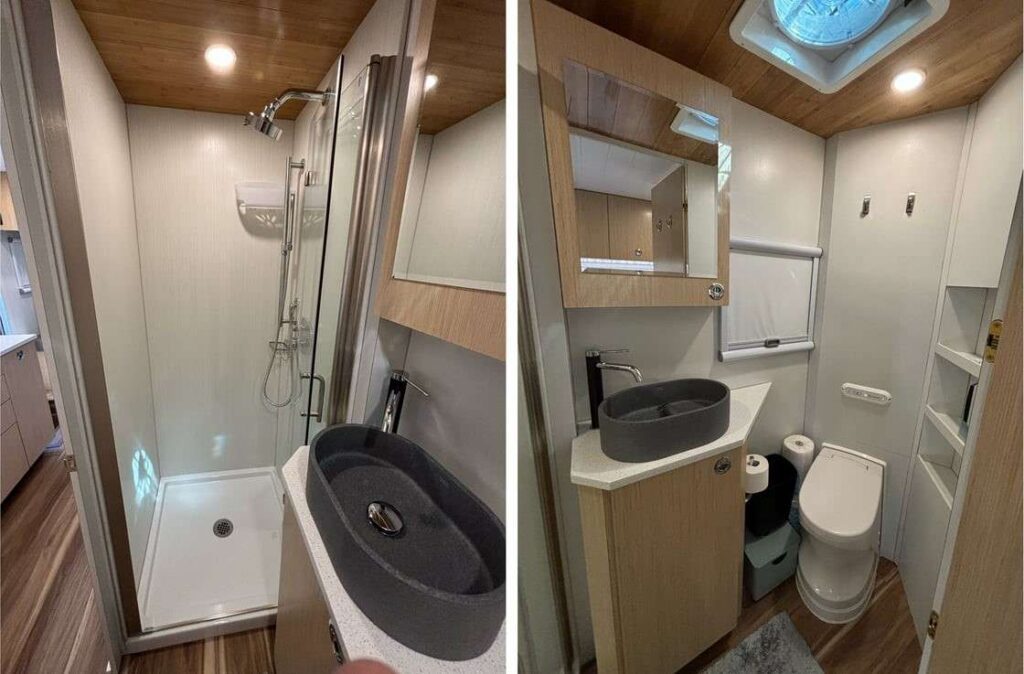 When it’s time to get your morning going or clean up from that awesome afternoon hike, suffering through a cramped “wet” bathroom isn’t exactly what those of us who want a comfortable camping experience desire. Wanderbox is known for its space-efficient bathrooms, which provide just the right mix of comfort and compactness, and this unit is no exception. The customer chose the color and texture of the one-piece WilsonArt Wetwall shower wall panels, picked out the Hansgrohe shower hardware, and opted for the Cinderella propane incinerator toilet to avoid the mess and maintenance of a black tank. The combination of the vessel sink, custom vanity, and side storage next to the toilet, along with the huge shower you-don’t-feel-squeezed-into make the bathroom experience of this unit both aesthetically pleasing and functionally satisfying. |