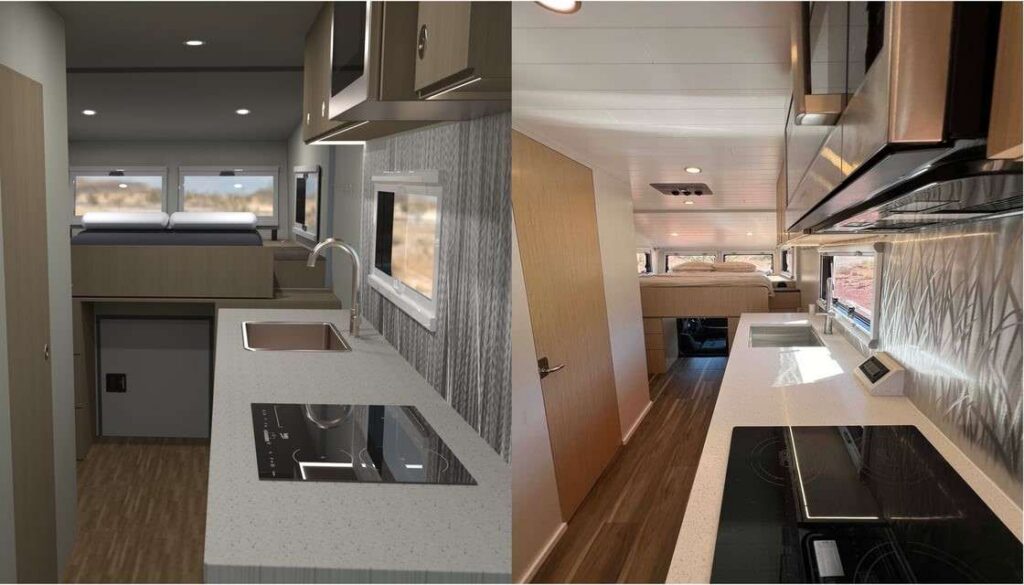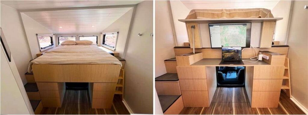 | The coolest feature of this build might be the north/south queen bed who’s foot opens via an electric linear actuator to reveal a full-size desk with monitor. Storage on each side of the desk makes this a digital nomad’s dream, and might get you in trouble with the rest of your posse if you don’t learn to pry yourself away from work and go on that mountain bike ride or whatever. Yeah that fast Starlink HP is cool, but Mother Nature is way cooler! |