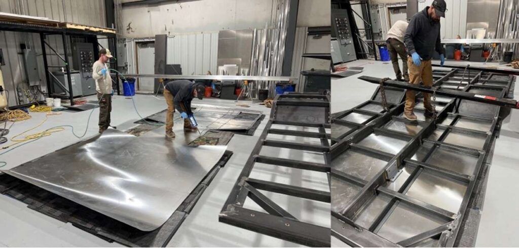 In our Gen1 subframe design that we used for Jay and Kelly’s Wanderbox, after the steel frame is cut, laid out, and welded, a thin sheet of aluminum is glued on the underside using glue that is specially designed to prohibit galvanic corrosion which occurs when steel and aluminum come in contact with each other. This aluminum sheeting creates a barrier on the bottom of the subframe that keeps insects, rodents, and the elements from entering the underside of the “basement” where many of the systems are installed, like water/waste tanks, HVAC, plumbing, and electrical system components.