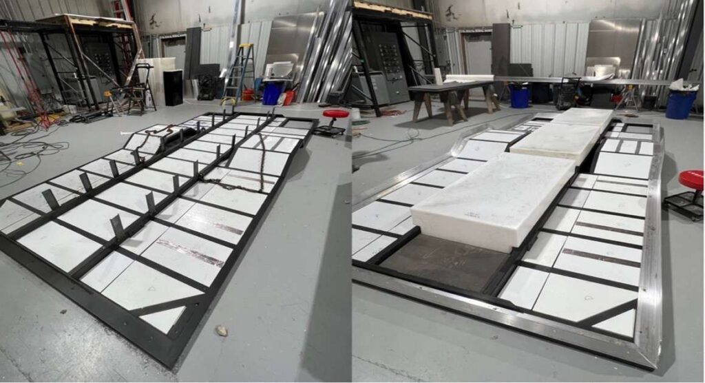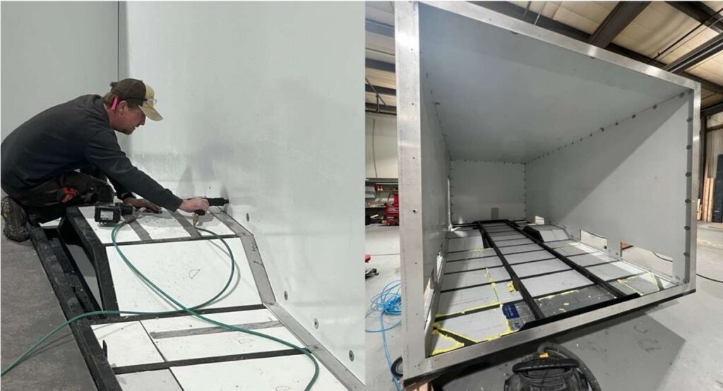 After the sheeting is installed, the subframe is primed and painted, and 2” of R13 polyisocyanurate closed-cell insulation is installed in the cavities of the subframe’s long sills (the long members that run front to back parallel/above the frame rails of the truck chassis and have the attachment points for mounting the subframe to the truck chassis) and the cross members. We then install the 4” x 4” x ¼” 6061 T6 aluminum angle that holds the walls to the subframe. Then Coosa, basically inorganic fiberglass plywood that’s used widely in the marine world, is fitted above the steel and insulation layer and glued firmly in place to make the floor of “the basement.”