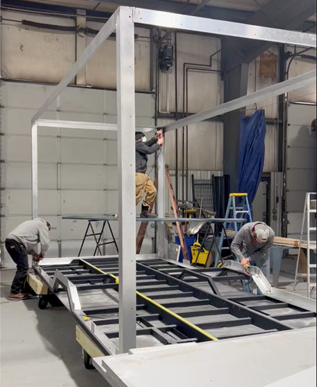 Hatches just below the floor line on the Gen1 units provide access to all systems that will be installed under the floor for easy access and servicing once the unit is complete. The rough opening for the pass-through between the cab and the main cabin is also cut in before the shell of this 29-foot rig is complete.