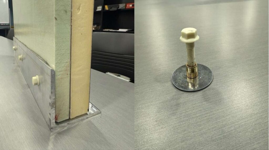 The bolts that we use to fasten the walls and roof in place and provide another level of structural strength beyond what our adhesives do are special glass-filled nylon bolts that are close to the strength of steel bolts. Because they have very low thermal conductivity, they are a simple yet very effective way to fasten our composite sandwich panels to our post & beam aluminum frame for the habitat with virtually no thermal bridging, requiring no special aluminum extrusions.